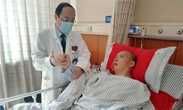 双侧瞳孔对光反应均迟钝,双侧眼球右向凝视;左侧肢体肌力1级,右侧肢体肌力0级(注:一般将肌力分为0-5级。“0级”为完全瘫痪,测不到肌肉收缩;“1级”仅测到肌肉收缩,但不能产生动作)……患者许先生本身是一位医务人员,去年9月,因左侧基底节脑出血在当地医院进行了手术。由于术后恢复情况不太理想,今年1月上旬,许先生的病情出现恶化趋势,因意识不清伴四肢肢体功能障碍,慕名转院至上海蓝十字脑科医院寻求进一步治疗。
