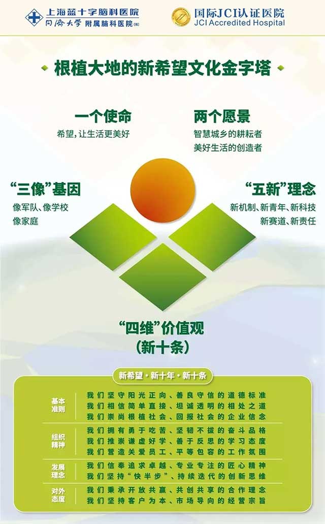 企业文化是企业发展的不朽之柱,文化建设有着潜在的凝聚力量,它不仅仅能给企业带来一种精神,而且是企业的“灵魂”,企业文化能激发员工的自豪感和责任感,培育企业团队精神,成为每一位职员工作导向。相信在新希望“植根大地的新希望文化金字塔”文化理念的指导下,上海蓝十脑科医院凝心聚力,一定会为患者提供更高品质的医疗服务,为人们的健康保驾护航,作出我们的贡献。