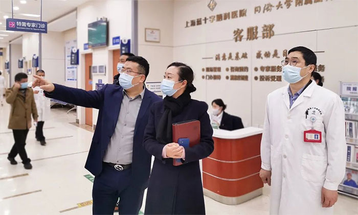 3月1日下午,闵行区七宝镇副镇长韩莉艳带领七宝镇社事办副主任诸忠德,七宝村党总支书记、村委会主任武臻帅等一行莅临上海蓝十字脑科医院调研指导工作。医院总经理兼党支部书记朱敏,副院长潘耀良、周克祥、郭俊艳等领导陪同接待。