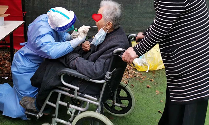 “爷爷,你在外面等一下,我出来给你采。”每当看到有坐着轮椅,行动不便的老人,李侨丽都会主动从核酸采样台出来,弯下腰、俯下身,甚至直接屈膝半跪在地上,为老人完成采样。让老人和家属都深受感动,赞叹不已。