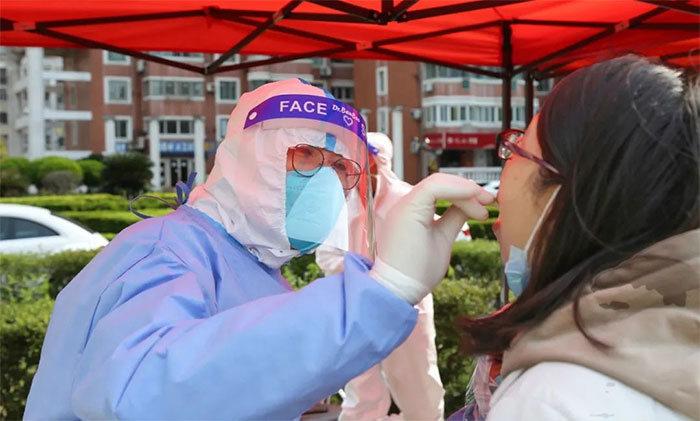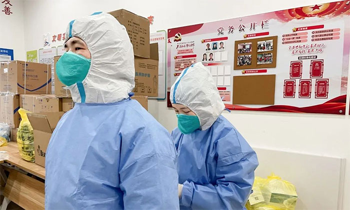 中医科欧阳慧、贾丹阳负责当天的“扫楼”工作。原来,在大上海国际花园小区有一栋居民楼及旁边别墅区曾出现阳性患者,该区域居民属于次密接,要进入该区域进行核酸采样,工作风险明显增大。接到任务后,欧阳慧、贾丹阳毫不畏惧,在做好充分防护后,立刻冲进该封控区。