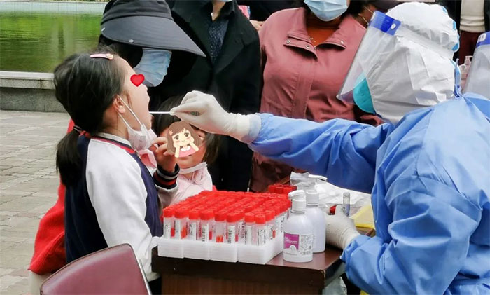 现场,14名队员被分成五组,一组位于小区大门处,另外三组集中在小区公园,依次纵向排开,还有一组负责扫楼。“来,嘴巴张大一点,头稍微抬一点,啊!”潘耀良副院长采样动作规范流畅,一气呵成。