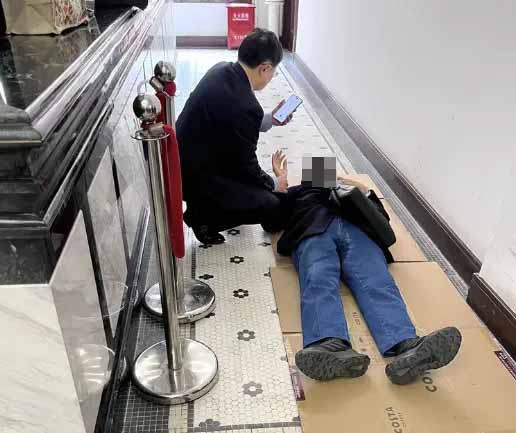 张杰主任边指挥现场人员拨打120,边将患者安置在通风处平躺,仔细检查其生命体征。此时,昏倒的老人双眼紧闭,嘴唇发白,呼之不应。张杰主任探查其脉搏心跳,该老人脉搏偏弱,便立即持续按压老人的人中,一分钟、两分钟……约八分钟后,老人缓缓睁开眼睛,恢复了意识。张杰主任仍不放心,随即掏出手机,默数他的脉搏,守护在侧。