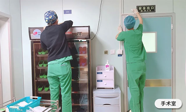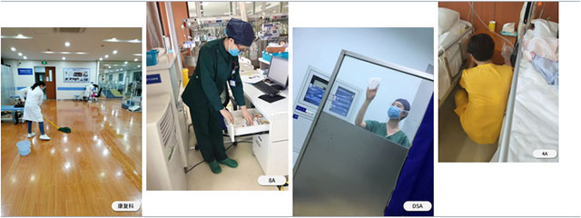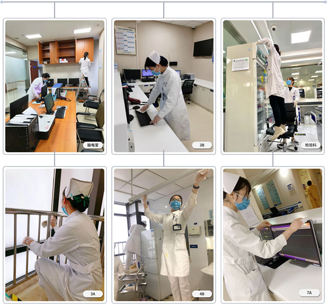 各科室/病区在科主任和护士长的组织下,医生、护士、护工等都分区包干,积极性高,利用休息时间甚至加班加点,重点对病房、办公区环境以及空调过滤网、走廊过道、病区临时医废点等公共区域进行彻底地清扫消毒,确保患者有一个整洁、舒适的住院环境。