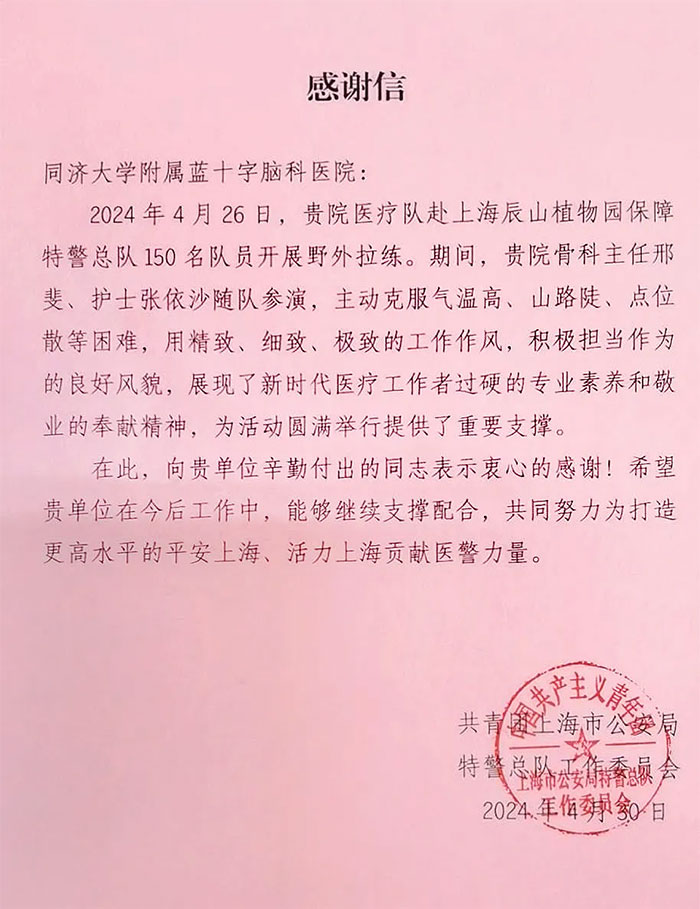 4月30日,上海蓝十字脑科医院【同济大学附属上海蓝十字脑科医院(筹)】收到了共青团上海市公安局特警总队工作委员会发来的感谢信,对医院及医疗保障队为其“五四”青年节主题野外拓展拉练活动提供医疗保障,用敬业专业和担当奉献确保了活动的圆满举行表示衷心感谢与赞扬。