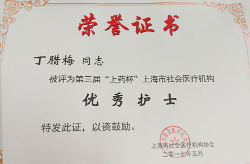 岁月见证成长,多年的历练与坚守,丁腊梅逐渐成长为护理岗位上的业务骨干、患者抢救的主力军、护士长的得力助手。她多次在专科理论与技能操作比赛中名列前茅,也多次在满意度调查中受到患者广泛赞誉,并受到院领导表彰与嘉奖。曾先后被评为区“优秀护士”,技能操作比赛“二等奖”,院级“优秀护士”等光荣称号。近日,她又荣获“上海市社会医疗机构协会第三届‘上药杯’优秀护士”称号!