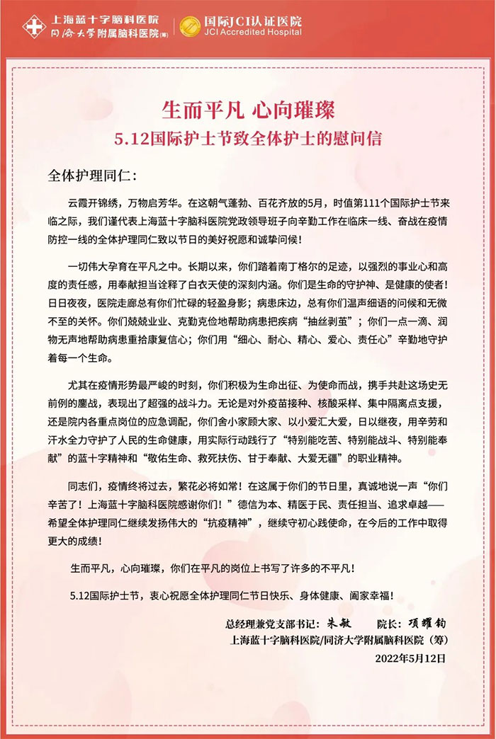 同志们,疫情终将过去,繁花必将如常!在这属于你们的节日里,真诚地说一声“你们辛苦了!上海蓝十字脑科医院感谢你们!”德信为本、精医于民、责任担当、追求卓越—希望全体护理同仁继续发扬伟大的“抗疫精神”,继续守初心践使命,在今后的工作中取得更大的成绩!