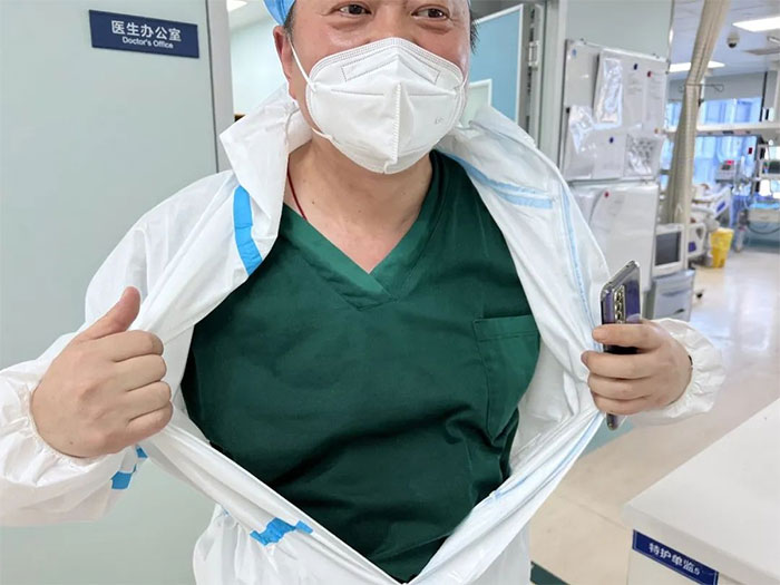 科室查峰、董浩杰、徐亚辉、翁振阳等医生主动留守科室;曹雨枫医生响应号召,义无反顾地支援兄弟病区。他们面对疫情毫不畏惧,穿着厚重的防护服奋勇向前,与赵枫主任一道,不分黑夜白昼,白班夜班连轴转,坚持战斗在抗疫和医疗救治一线。年逾七旬的李鲁萍主任因疫情影响封控在家,但她时刻心系科室,每天参与视频查房,指导重点患者的诊治工作。