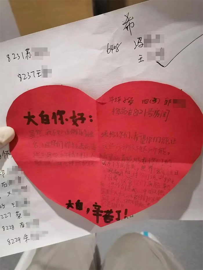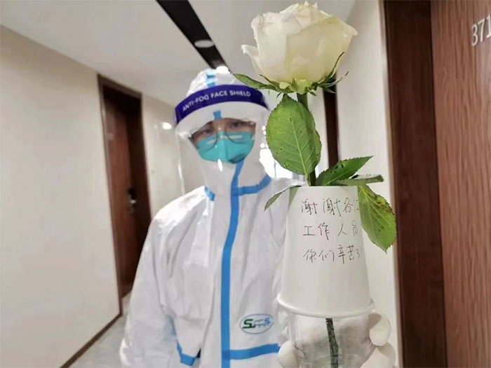 我们热情的态度、专业的操作赢得了住客们的赞赏。当他们解除隔离时,有人送来感谢信,留下新的防护服;还有人通过外卖订花,感谢我们的付出(虽然不能出去拿花)......这些都让我特别感动又温暖,同时感受到了作为一名医务工作者的自豪,让我们觉得一切的付出都很值得。
