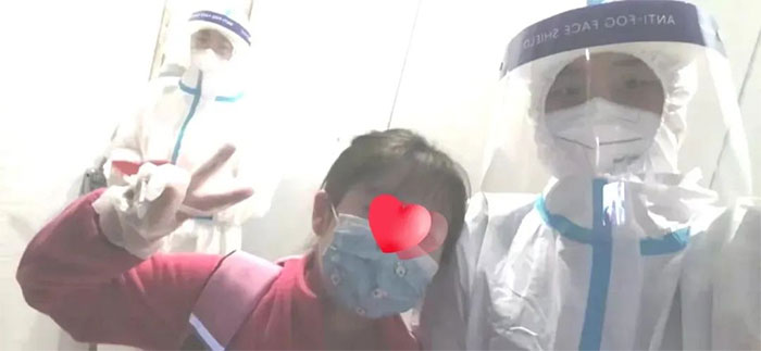 ▲ 一位解除隔离的小姑娘临别致谢,并合影留念