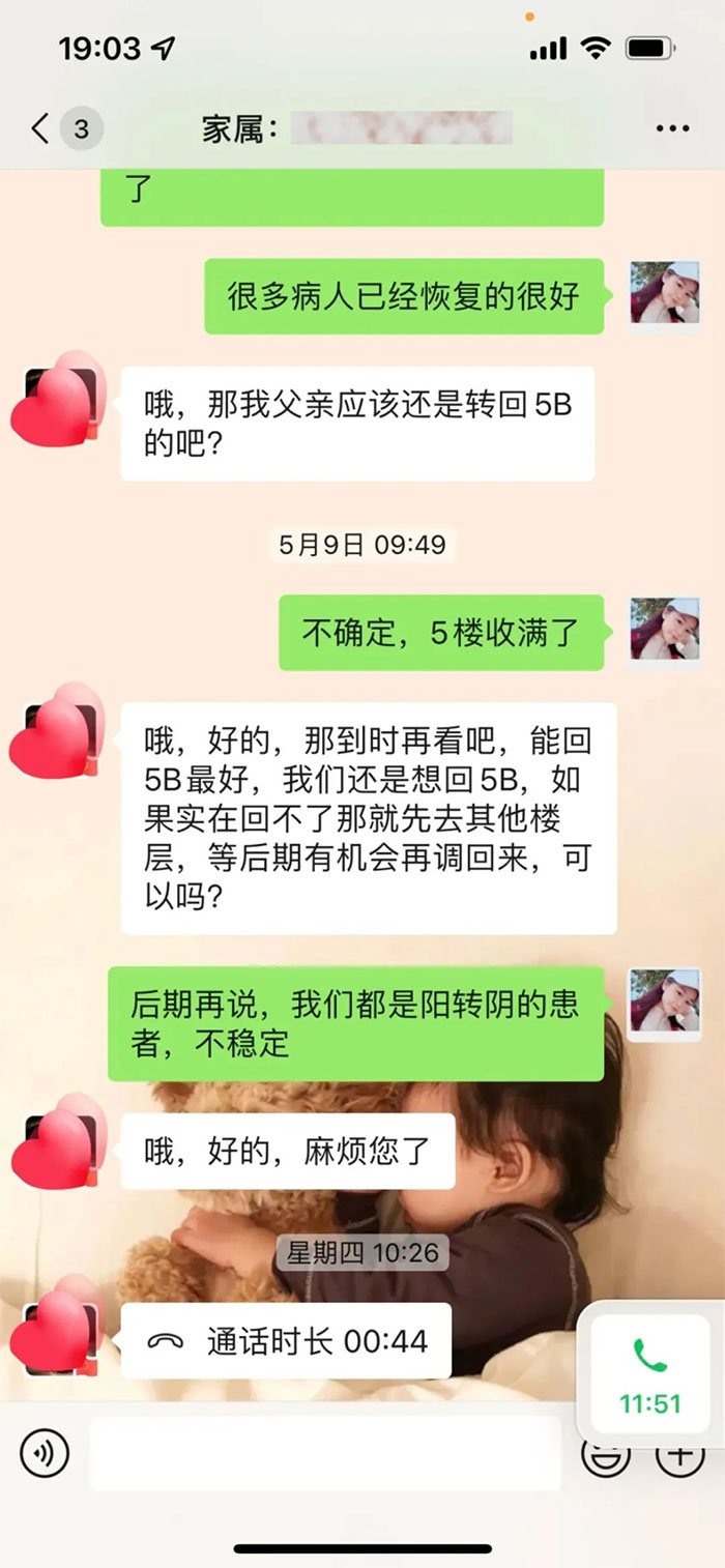还有不少患者及家属对医院,对5B病区有着深厚的感情。因为认可科室的治疗护理服务,他们和余志良主任团队既是医患,也是朋友。在抗击疫情这一特殊时期,有患者家属主动为医护人员“打气”,还鼓励其他病友“同舟共济”、“坚持就是胜利”,还有患者在住院期间不幸感染病毒,转阴并解除隔离后迫切希望能重返5B病区。