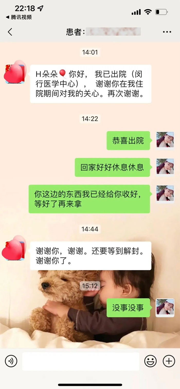 正当陶老伯恢复得越来越好时,他不幸感染了新冠肺炎病毒,被转运至方舱医院隔离治疗。解除隔离后,怀着感激的心情,陶老伯第一时间发微信给黄朵朵“报平安”:“你好,我已出院,感谢你在我住院期间对我的关心。再次谢谢。”言语朴实无华,却又是那么情真意切。