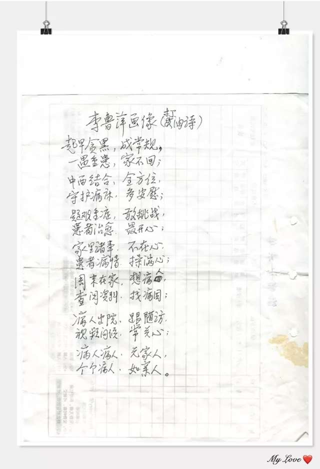 20日一大早,天刚蒙蒙亮,准备赶往医院上班的李鲁萍就在饭桌上看到了这首打油诗。在上海蓝十字脑科医院工作这么多年来,心系着每一位患者的安危,她始终是科室“来得最早,走得最晚”的人。没来得及细细品味这份特殊的生日礼物,李主任就将打油诗塞进包里出门了。