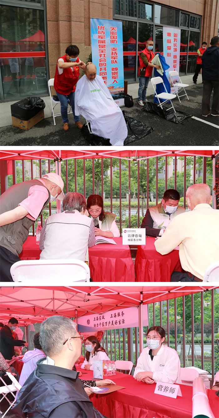 为迎接中国共产党诞辰100周年,在5月27日上海解放72周年纪念日这个特别的日子里,“拥军优属 固我长城”志愿关爱公益活动在杨浦区新江湾城军休服务管理中心举行。志愿服务总队整合社会化拥军优属资源,共出动7个专业志愿服务队共200多人,现场设立法律援助、家政服务、大健康、文化工作等30多个专业化服务项目。各专业志愿服务队云集了法律、艺术、医疗、餐饮、家政等多领域专家学者和能工巧匠。活动采用综合集成融合,整体发力,实现优质高效,推进社会化拥军优属走向新高度,吸引逾千名老同志前来相关项目接受服务。