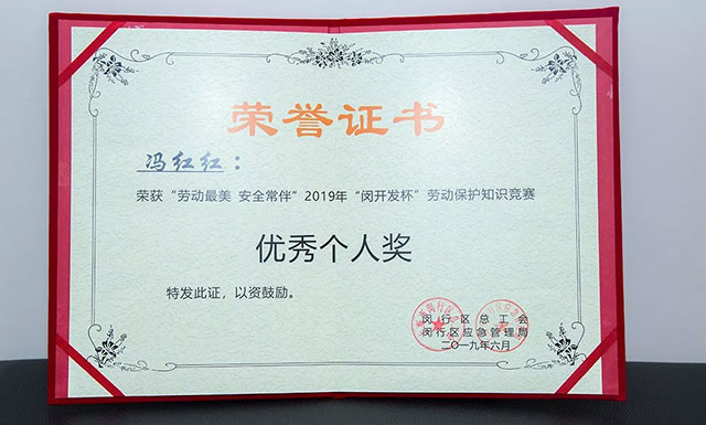 在此次决赛中,上海蓝十字脑科医院代表队除了获得“ 2019年闵行区劳动保护知识竞赛决赛”二等奖的好成绩外,参赛成员康复科组长冯红红更是获得了“优秀个人奖”,这与团队的协作及她个人的努力是分不开的。自2015年7月,冯红红就职于上海蓝十字脑科医院康复医学科四年以来,她表现突出,连续两年被评为年度个人嘉奖,并在国际JCI认证评审期间因突出表现,被评为先进个人。