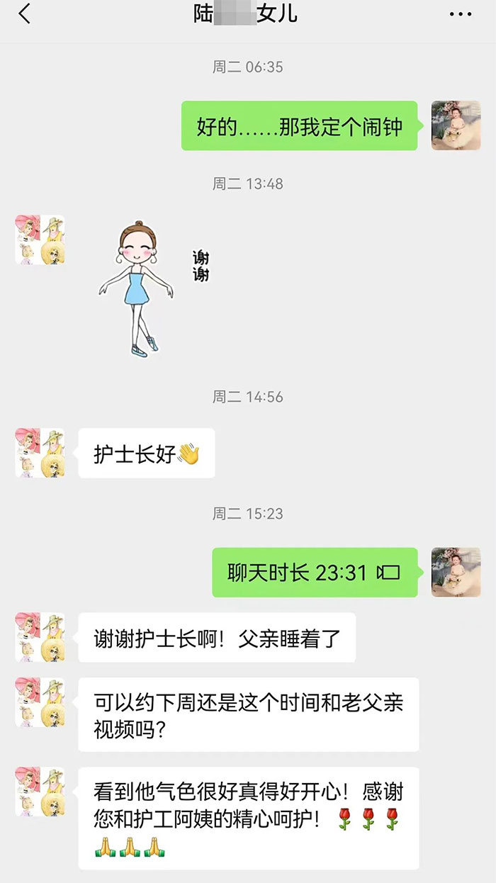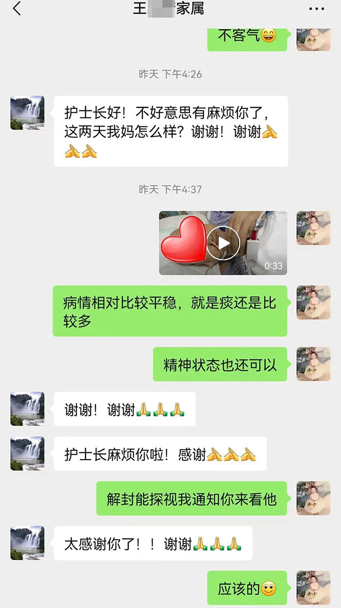 疫情防控之下,医院谢绝家属探视。8A团队推己及人,用拍照和录视频的方式将患者的病程进展尽可能具象地呈现给家属。患者陆某为脑出血患者,遗留肢体障碍,长期卧床,并发严重肺部感染,经过团队悉心救治病情平稳。家中四个女儿,尤其是小女儿远在国外,十分牵挂病重的父亲。为此,团队专门为她们建了一个微信聊天群,每天在群里发送老人的情况。小女儿只有每周二有空,胡燕华便定好闹钟,定时与其小女儿视频,让她每周都能通过视频见见父亲。还有更多的患者,也是通过8A团队这样的用心良苦以解相思之苦、牵挂之心焦。“辛苦了,万分感谢!”“太人性化了,很感动!”家属纷纷表达感谢!