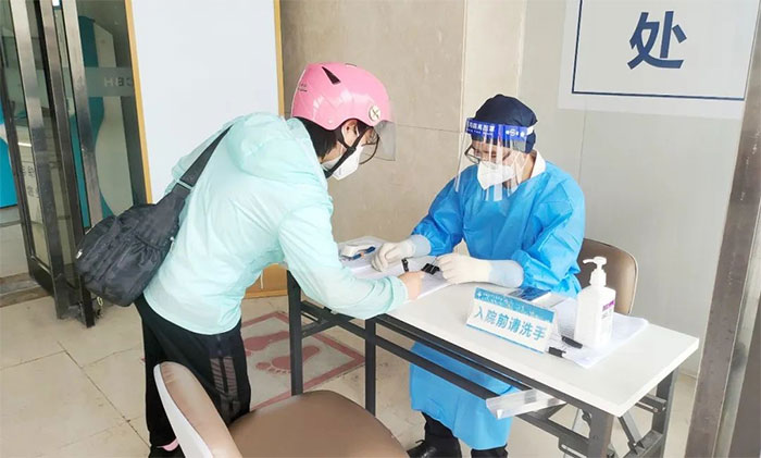 进入门诊大厅,工作人员在入口为每一位前来就诊的居民测温、流调、预检、分诊,严把防疫关口。