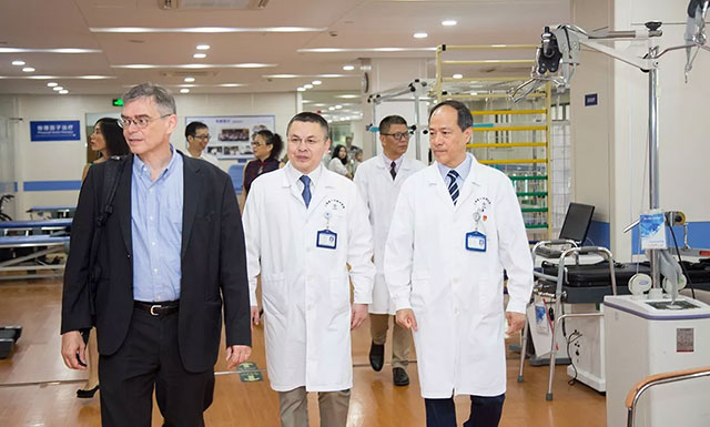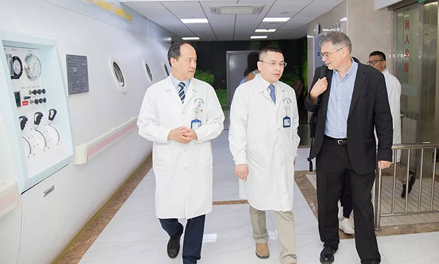 Andreas Heinz教授一行首先参观了医院手术室。随后,深入ICU重症监护病区、脑血管病区、神经外科、康复科、高压氧科、医学影像科、DSA介入科及放疗科等特色科室进行考察。