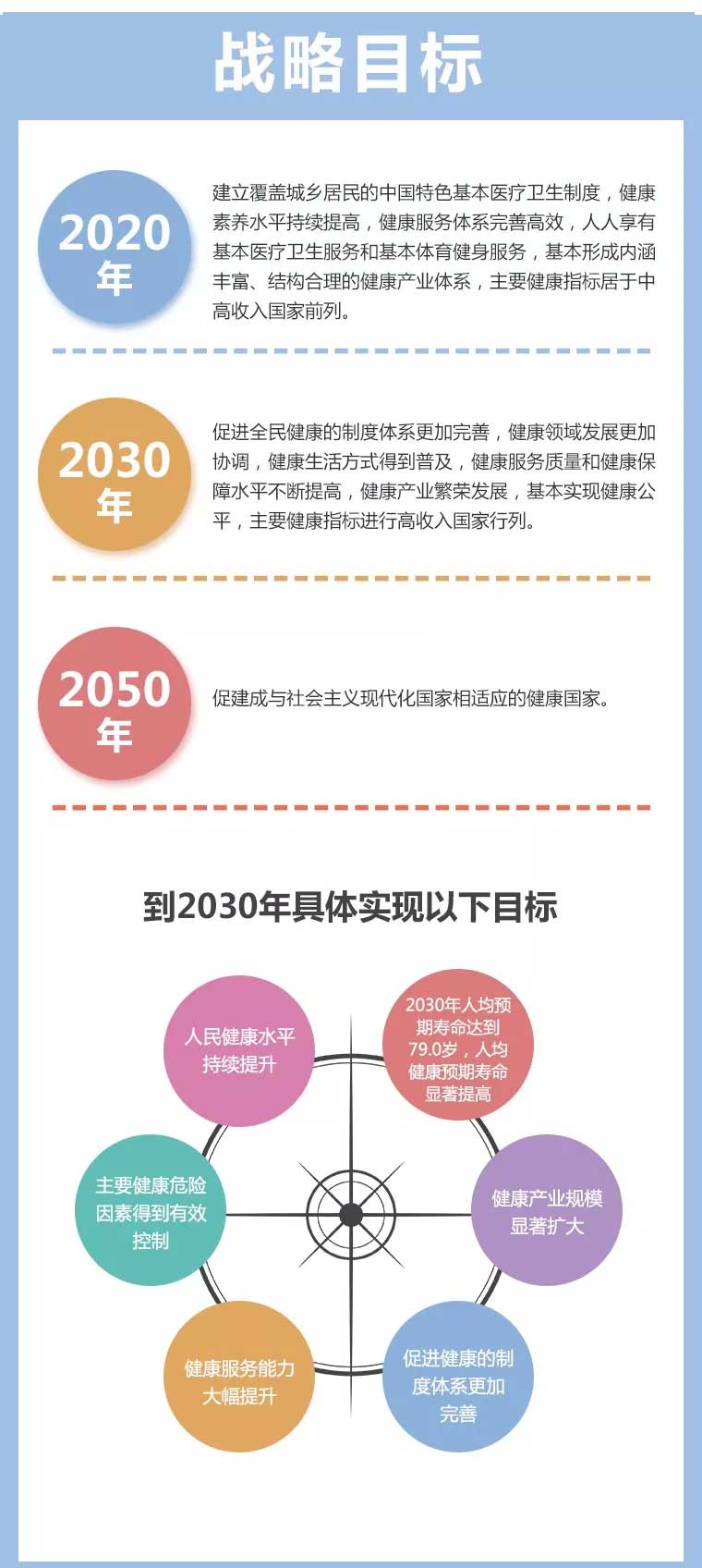 根据总体目标,到2030年,全民健康素养水平大幅提升,健康生活方式基本普及,居民主要健康影响因素得到有效控制,因重大慢性病导致的过早死亡率明显降低,人均健康预期寿命得到较大提高,居民主要健康指标水平进入高收入国家行列,健康公平基本实现。