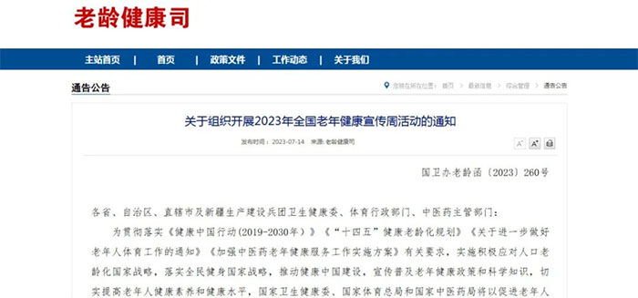 从国家卫生健康委员会获悉,7月24日至30日,国家卫生健康委、国家体育总局和国家中医药局将联合开展2023年全国老年健康宣传周活动。今年宣传周活动主题是“科学健身助力老年健康”,以促进老年人科学运动为重点,切实提高老年人健康素养和健康水平。