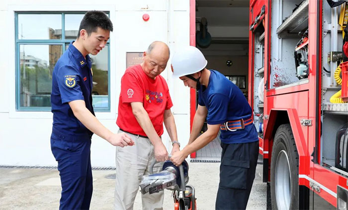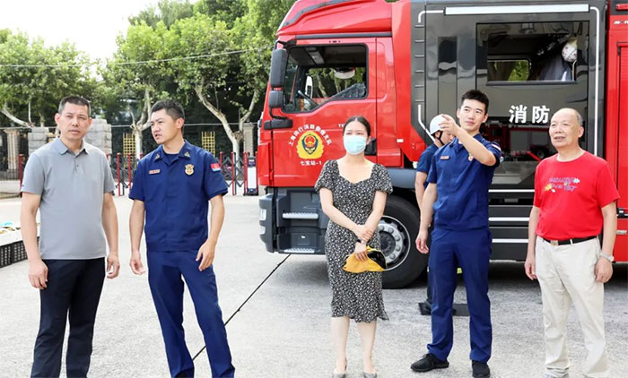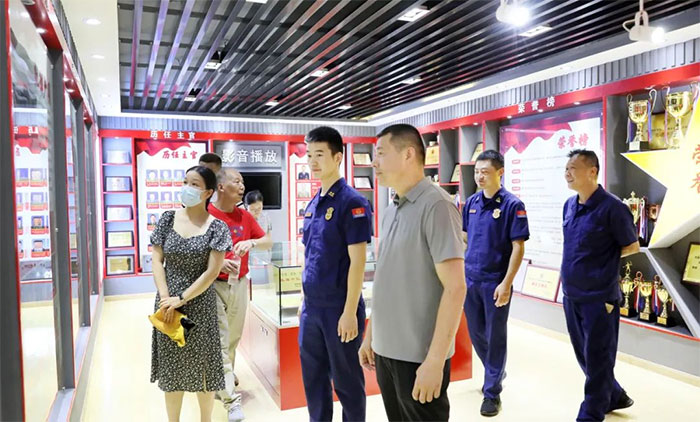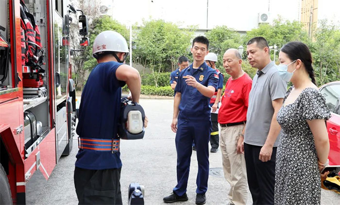 随后,在潘曙鸿站长和张翔指导员的陪同下,驻足车库前消防车旁,听取消防战士一一讲解并展示救援衣、电动液压顶杆、无齿锯等救援器械的作用及使用场景。