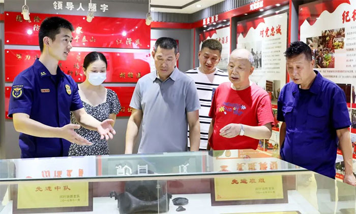 最后,大家走进承载七宝消防救援站历史与光荣的荣誉室参观。聆听着潘曙鸿站长和张翔指导员的仔细讲解,通过一张张鲜活具象的照片、一件件烟熏火燎过的文物、一座座金光闪闪的奖杯、一面面绚烂夺目的锦旗,重温救援站一代代消防官兵“对党忠诚、纪律严明、赴汤蹈火、竭诚为民”的感人事迹。