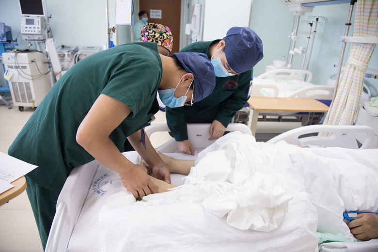 下午1:30,张棕智开始同护士们一起进行病人基础护理。ICU的很多患者长期卧床,每天都要定时进行翻身拍背,清理大小便,清疮擦药等等。不管味道有多么恶臭难闻,他们也从不会退缩。给患者擦洗身体、修剪指甲、拍背咳痰、按摩活动,每一样都做得事无巨细。