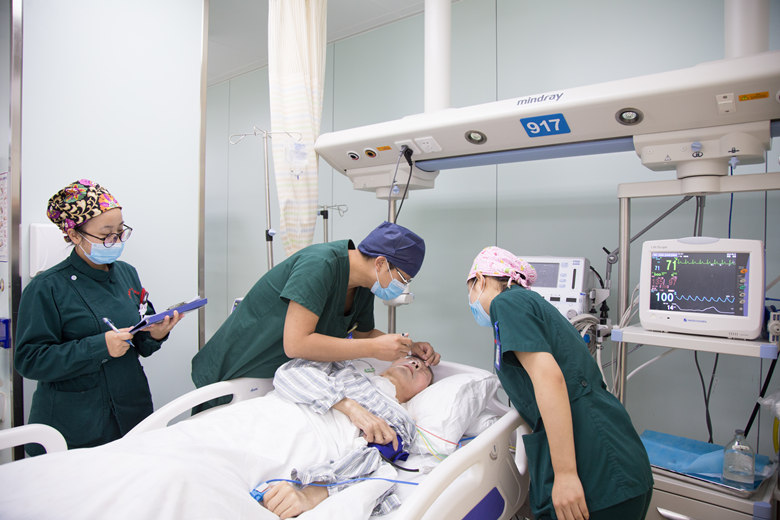 3:30至4:00,是每天固定的家属探视时间,这也是护士们最最忙碌的时刻。张棕智耐心地和家属进行沟通,解答家属的疑问,减轻家属的心理压力。924床脑梗塞患者xxx是目前恢复情况较好的一位,刚进来一直处于昏迷,现在已经苏醒,成功脱离呼吸机,再过两天便可转入普通病房。张棕智走到病床前,老人紧紧攥着他的手不愿松开。患者女儿也感动不已:“没想到会康复的这么好,家里人很惊喜,要感谢的是护士,他们像对待自己的父母,不怕苦不怕脏,我们都看在眼里。”