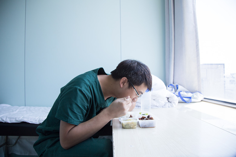 12:30,由于饭点已过,姑娘们帮忙带回来的饭菜已经冰凉,他吃的很快,并笑称这是长期养成的职业病。其实,护士是个繁忙且辛苦的职业,不光按时吃饭是一种奢侈,而通宵加班,24小时紧急待命更是ICU护士的家常便饭。长年累月下来,每个护理人员还会落下不同程度的职业病,张棕智也不例外,十几年大任务量的护理工作,让他的颈椎、手臂都有过度劳损症状,需不定期进行康复治疗。