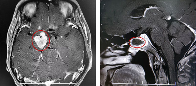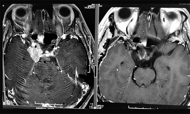 患者蔡先生(化名)因持续头痛、视力下降被查出是垂体无功能巨大腺瘤,肿瘤大小超过3cm。在杭州一家医院做了经蝶窦垂体瘤切除手术后,由于术后肿瘤残余较多,出现头痛情况,视力较术前未见明显改观,左侧视力0.12,右侧视力0.1。后慕名来到上海蓝十字脑科医院。