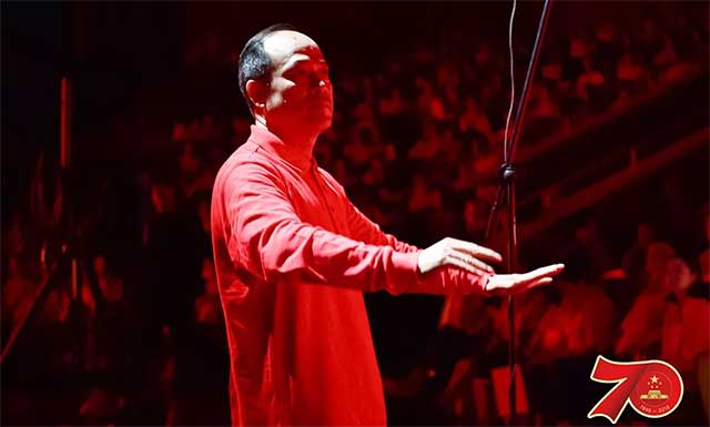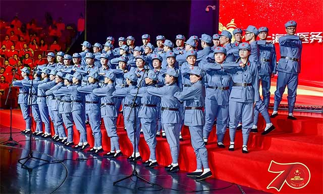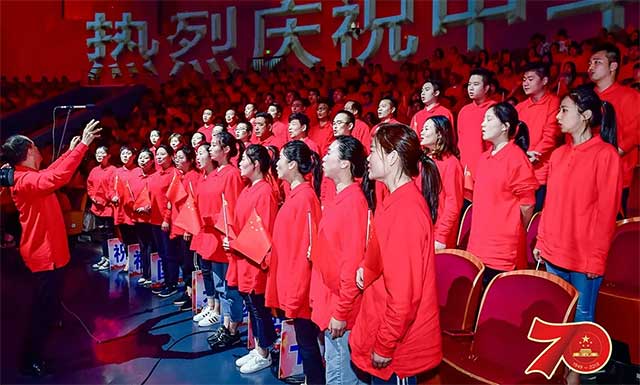 接着,全场在《爱我中华》嘹亮的歌声中,主题歌会正式拉开帷幕。歌会分为峥嵘岁月稠——再把春来报——礼赞新中国——奋进新时代4个篇章,共12首合唱曲目。《十送红军》《沁园春.雪》《红旗飘飘》《不忘初心》《生命之爱》......当这些熟悉的旋律和歌声响起,在场几乎所有人都激动而兴奋起来,挥舞着手中的五星红旗,仿佛又回到了激情燃烧的岁月。