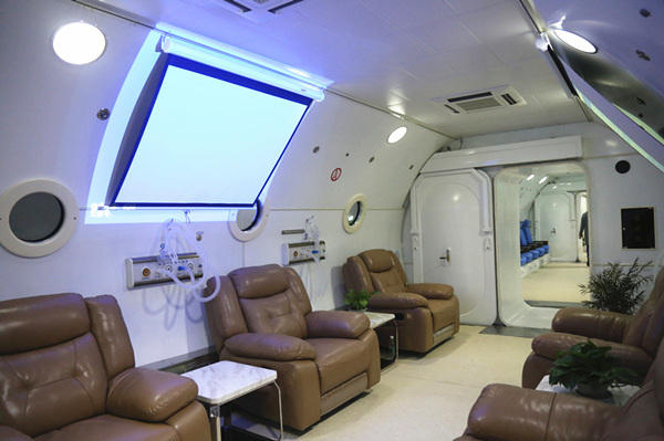 配备了多功能吸氧装具及急救医疗模块,具备常规吸氧、雾化吸氧和一级吸氧及负压吸引多种功能,可充分满足各类高压氧适应症患者在氧舱内吸氧治疗和重症患者在氧舱内抢救治疗的需要。