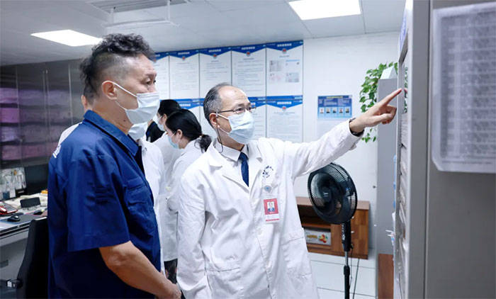 检查组一行深入药房、静脉输液集中配置室、消控室、设备机房、库房、配电室、电梯间等重点场所,针对消防安全、医疗安全、设备运行、药品管理、信息安全、后勤保障等关键环节进行全面排查。
