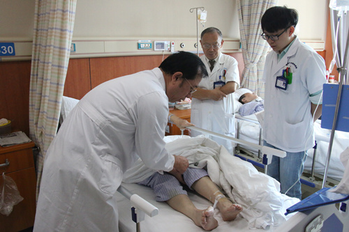 4“医生开放周”第四天。9月22日,监督员诸忠德、余乐兴和孔曼美在五楼神经内科病区跟随该科李振并主任查房一起“查房”,三位穿着白大褂的监督员还饶有兴致地问着李主任好多问题,并与病人家属攀谈起来,打听他们住院的感受和对医院印象。监督员余乐兴说李振并医生查房真是耐心细致,不仅医疗水平高,而且还是那样的百问不厌,和蔼可亲。当监督员诸忠德问李振并医生从医三十多年如何能做到这点时,李振并主任坦诚地说:“医者,仁心,治病救人是天职,面对患者的生命,医生们都还是会用自己所学,尽心尽力地救治每一个病人,没有哪一个医生不愿意治好患者。”