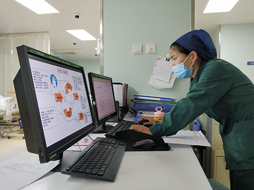 ▲ICU护士在病房里录入患者信息,密切关注病人情况