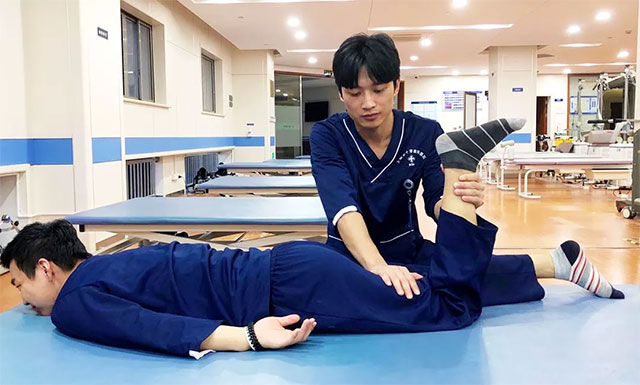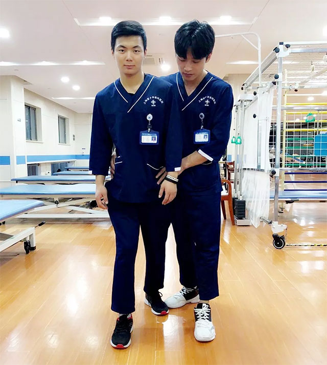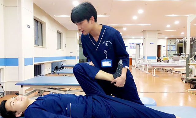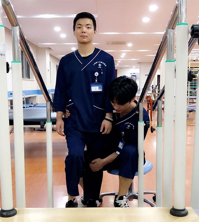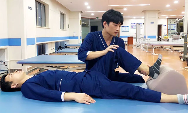 下列图片中,上海蓝十字脑科医院神经康复医学科康复团队模拟演示brunnstrom疗法。