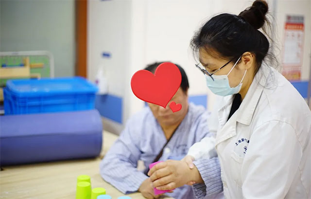 ▲ 双节期间,申颖在为病患做肌张力恢复锻炼