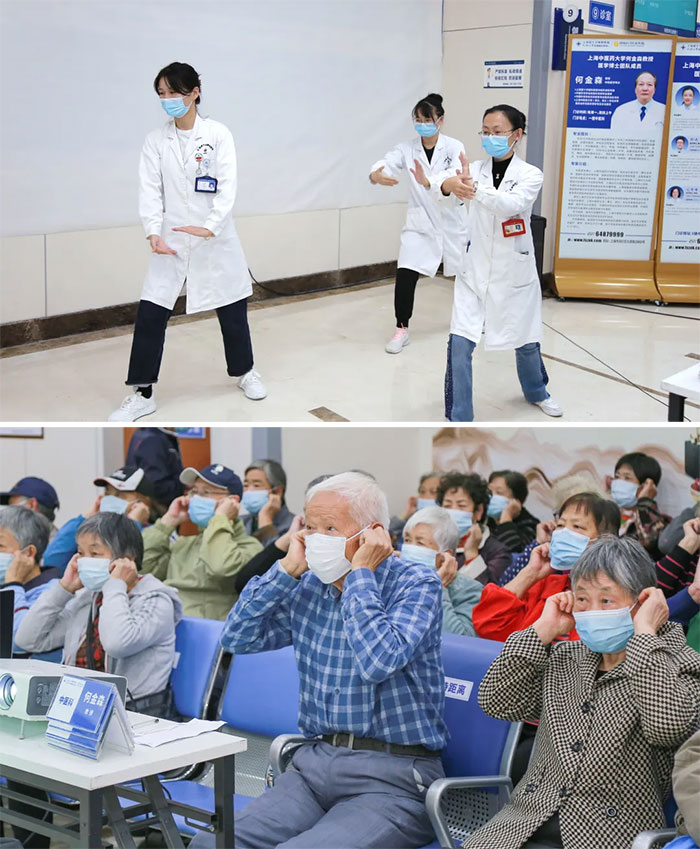 “左脚开步,与肩同宽,屈膝下蹲,掌抱腹前……”随后,中医科三位医师随着悠扬的音乐表演八段锦。在颇富意趣的暖场环节中,我院第二届膏方节盛情开启。