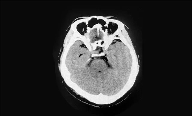 头颅磁共振检查显示,额部(中线处)见团状异常信号灶,矢横高径约5.8*5.5*5.4cm,周围脑实质受压移位,肿块向鞍内生长。