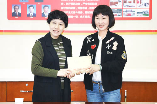 福鼎市教育工会主席胡颖如(右)将捐助款交给郑元齐妻子