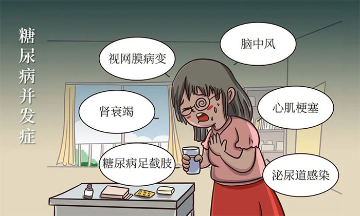 糖尿病被称为“不死的癌症”,糖尿病患者常伴有脂肪、蛋白质代谢异常。长期高血糖可引起多种器官,尤其是眼、心、血管、肾、神经损害或器官功能不全或衰竭,导致残废,甚至过早夭亡。糖尿病常见并发症包括卒中、心肌梗死、视网膜病变、糖尿病肾病、糖尿病足等。具体危害表现为: