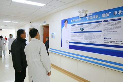 在三楼,当看到功能神经外科主任杨忠旭博士开展的诊疗范围和已做过的众多案例时,张会长情不自禁地说:敬佩有加!医院专家团队强大,专科特色明显,而且脑部手术风险很大,你们敢在大脑上做“文章”,也证明了你们的医疗技术的精湛和成熟。