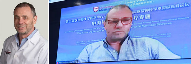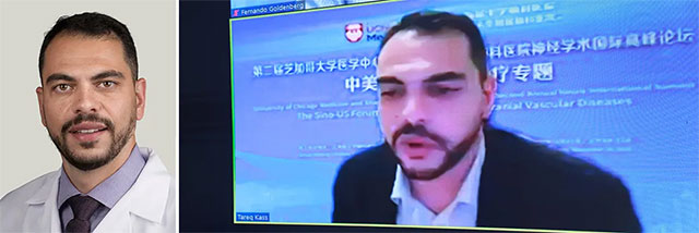 UCM神经科主任Shyam Prabhakaran, M.D.首先简单介绍了芝加哥大学神经科学中心的12位杰出专家学者、两大享誉世界的神经科学项目、四大神经科和神经外科中心及项目。随后以《颅内狭窄的药物治疗和介入干预》为题,从颅内动脉粥样硬化狭窄(ICAD)背景、诊断和机制、治疗选择、MYRIAD试验的发现和展望等方面进行阐释,研究复发卒中伴有症状的ICAD患者的自然病程;引用之前的介入治疗和药物治疗的临床试验以减少ICAD患者再发卒中的风险;评估卒中的各种机制,探索未来针对有症状ICAD患者的临床试验的潜在治疗目标,同时分析了目前面临的挑战。