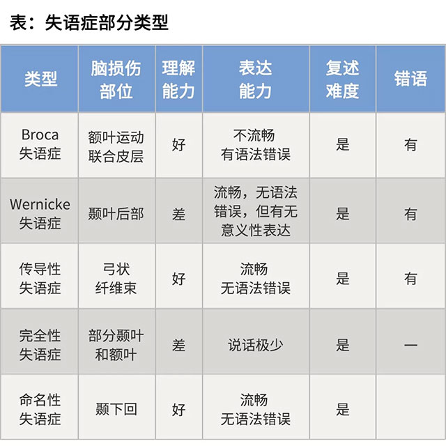 失语症指人的语言理解和运用能力的受损或丧失,表现为听、说、读、写或手势等某一方面或几方面的功能障碍。(参见下表:)