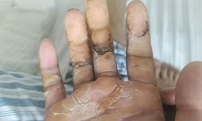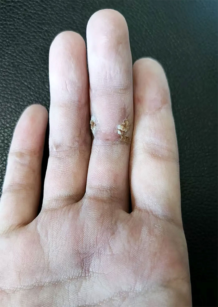 ▲ 入院时,患者手指肿胀僵直,屈伸功能受限