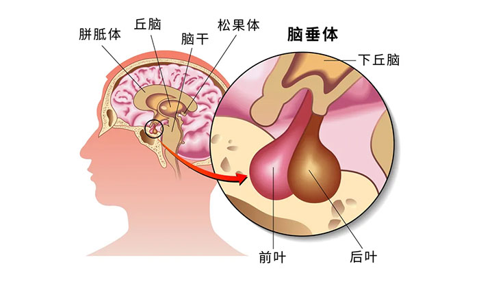 脑垂体位于丘脑下部的腹侧,为一卵圆形小体,它分泌多种激素,如生长激素、促性腺素、催乳素、促肾上腺皮质激素、甲状腺激素等。