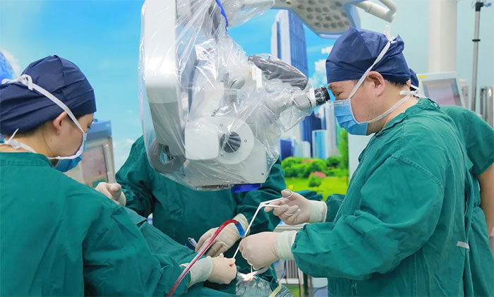 术中,在蔡司显微镜(双荧光)下,见淡红色肿物,质软,与周围垂体边界较清楚。李士其教授在充分保护好海绵窦、颈内动脉、视神经等结构前提下,在错综复杂的神经血管狭窄间隙中,逐步分块切除肿物,仔细刮除,直至顺利完成手术。