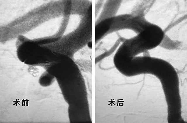 随后,在蔡女士和家人了解了两种手术方法利弊后,他们更倾向于介入治疗。在获得患者和家属全力支持,手术准备就绪后,张琪主任在医护团队的协助下于3月19日,为患者进行了动脉瘤介入栓塞术。张琪博士顺利为患者填入弹簧圈,再置入支架,完全释放后,造影显示动脉瘤无显影,支架覆盖良好,载瘤动脉通畅,撤出微导管输送系统,手术历经2个小时,顺利结束。
