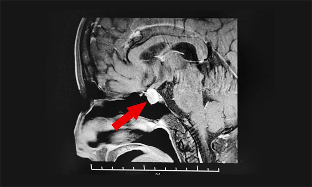 核磁共振检查结果很快出来了:考虑垂体大腺瘤伴卒中。“一般来说,垂体瘤压迫引起的头痛和视力减退不会那么来势汹汹。但患者因为垂体瘤内出血,导致垂体瘤体积在瞬间增大数倍,压迫鞍隔出现剧烈头痛、呕吐等脑膜刺激症状,再向上压迫视神经造成视力、视野的改变,甚至会永久失明,最终会导致下丘脑受损,出现昏迷直至离世,后果不堪设想。”潘仁龙主任表示。