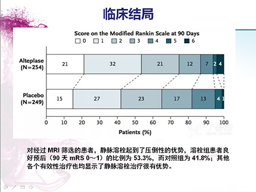 通过对503例患者分组(254例随机分配至静脉溶栓组,249例随机分配至安慰剂对照组)比对观察研究显示,对经过磁共振DWI-FLAIR 检查存在不匹配的发病时间不明患者,静脉溶栓治疗是较好手段。